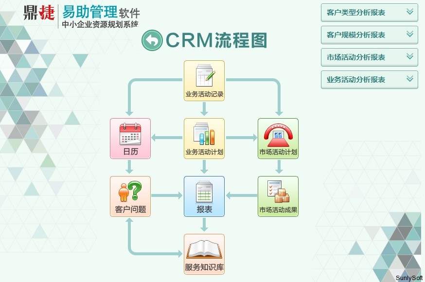 ► 提供潜在与正式客户的关系管理,提供客户来源、行业别、分级、规模、接洽方式等多角度客户分析。