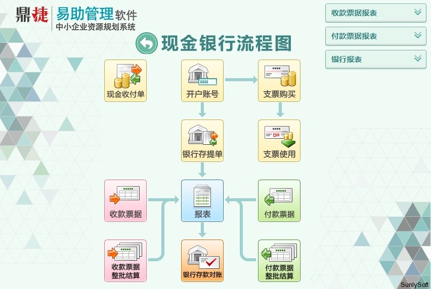 ► 提供各类票据结算工具,收/付款票据可由应收/应付系统串联产生,也可在票据系统自行录入后,由应收/应付的前置单据挑选匹配。