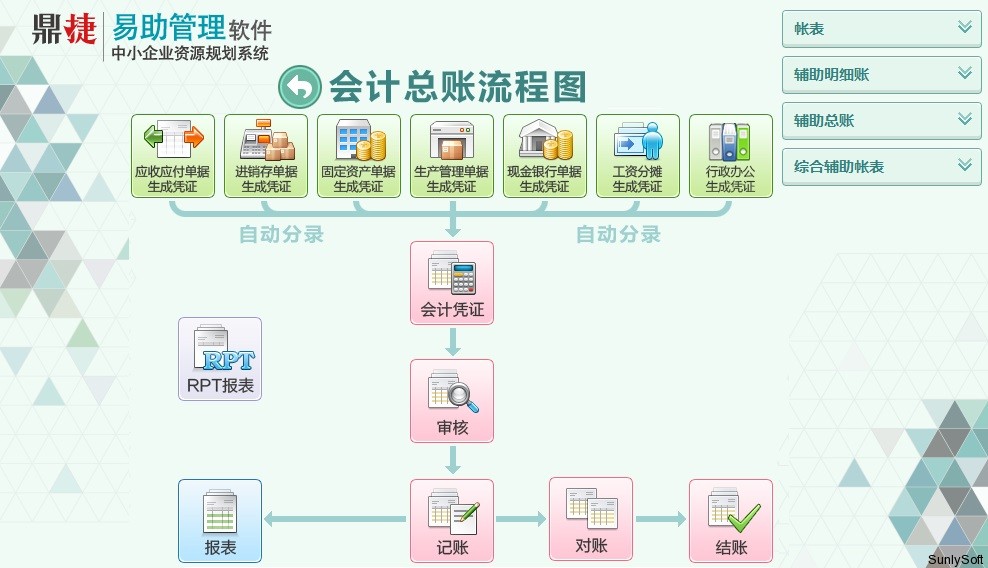 ► 只需输入或自动产生会计凭证,即可实时产生所有账册和财务报表。