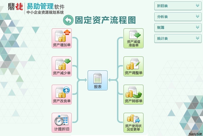 ► 系统预设置符合企业会计制度规范的折旧方法(平均年限法、年数总和法、双倍余额递减法、工作量法),满足企业的管理需求。