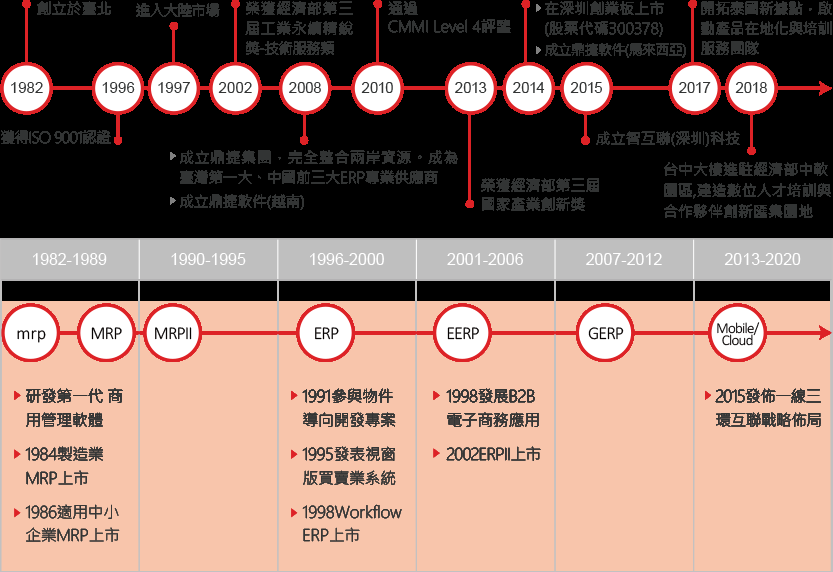 鼎新软件1982年在台湾成立,而随60至70年代,全球制造业板块由欧、日迁移至台湾、香港、新加坡和韩国,在制造业蓬勃发展的契机里,经80年代末近10年的耕耘,鼎新占有台湾超过70%的
